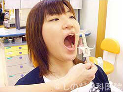 当医院では、問診・触診などの診査により、その症状に合わせた治療を行います。次の写真は顎や筋肉の痛み、こりなどの検査をしているところです。状態によっては、歯の模型を作って半調節性咬合器に模型を付けて診査します。
